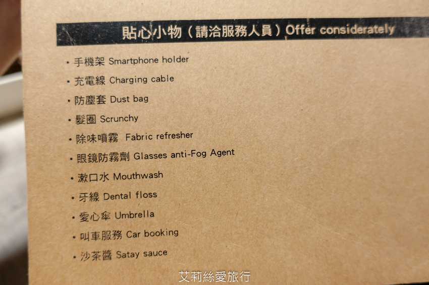手機架、充電線、防塵套、髮圈、除味噴霧、眼鏡防霧劑、漱口水、牙線、愛心傘、叫車服務、沙茶醬。