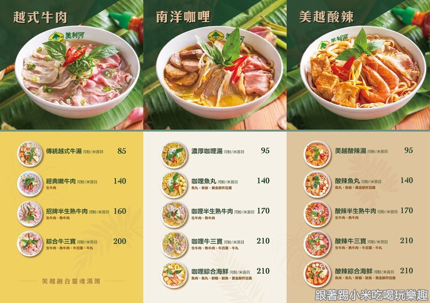 來看看菜單吧!菜單除了傳統的越式牛肉河粉以外,還有搭配南洋口味南洋咖哩及美越風格美越酸辣都可以搭配米苔目或河粉,可以給大家有不同的選擇。