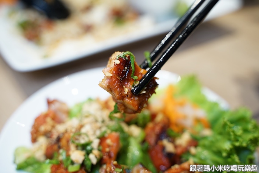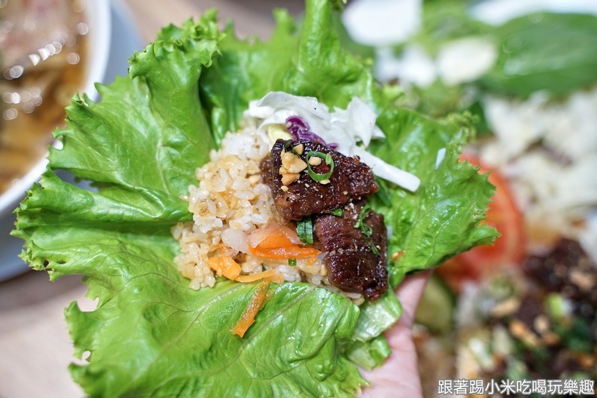 另外,還有越式的吃法,配上生菜、小黃瓜、番茄,再加上他們特製魚露的酸V口感夾著來吃,不僅有吃肉爽爽還有青菜健康的口感