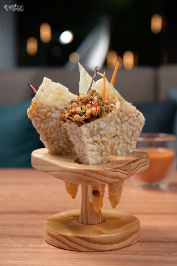 切丁炒香的松阪豬,保有鮮嫩與彈性的口感,香茅特有若有若無的檸檬香氣,混合著淡淡溫和的酸與輕微的辣,盡顯酸酸辣辣的泰式風味,搭著脆口的米捲,演繹出相當迷人的風采。