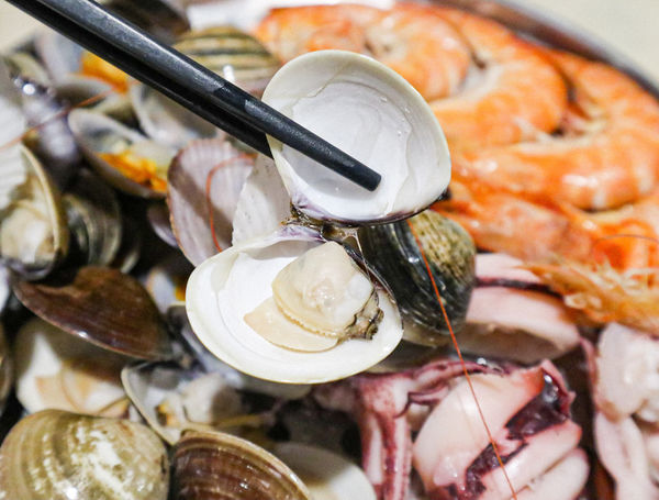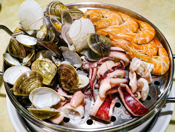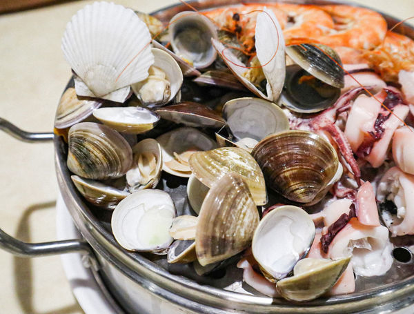 👉首先先蒸第一層是鮮蝦類、鮮卷類、綜合貝類,滿滿一籠好誘人