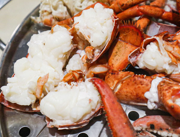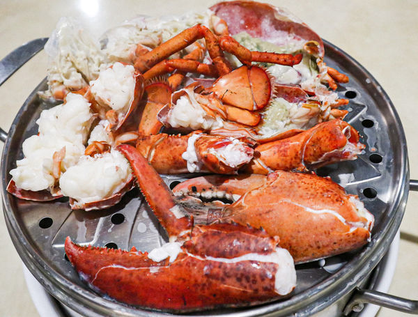 波士頓龍蝦乙隻、鮮蝦、綜合貝類、鮮捲類乙籠、海鮮蒸蛋乙份、火鍋肉片-雪花豬或雪花牛,黃金干貝粥乙份、餐後小點,附ㄧ份火鍋菜盤