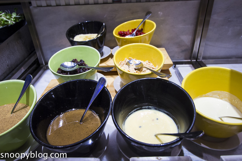 涼拌沙拉區提供有水果優格沙拉、主廚沙拉、燻鮭魚、黑胡椒牛肉和溫泉蛋,