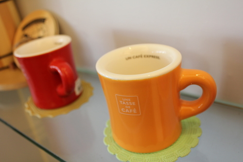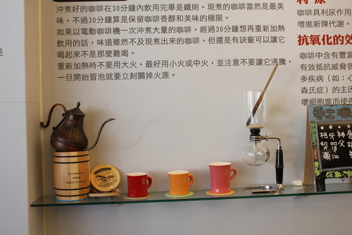 大坑店有許多咖啡相關器皿的陳設,其中une tasse de cafe 也很吸睛,因為好奇,也趁機來做一些筆記與認識吧。這是家日本品牌的公司,是很有名氣的雜貨製造商,名為Meister Hand,une tasse de cafe圍棋下的一項產品,這組陶器看起來相當厚實,但是拿起來卻不重,網路上查,才知道,這個馬克杯,圓錐形陶瓷濾器是一組的,這系列的咖啡杯,色彩都相當鮮艷,概念主要是來自法國的明亮色彩與日本的傳統美的結合,手感輕盈,兼具保溫效果。查到的資訊不多,但是,暫也夠我認識此品牌了。