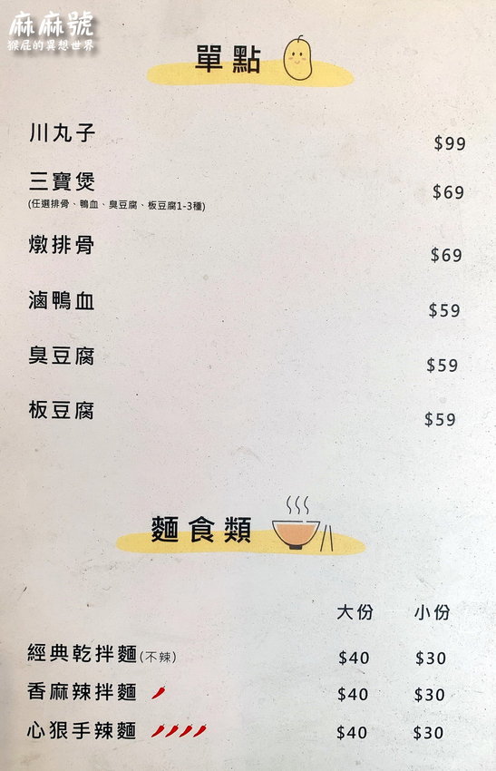 他的麵食有三種,經典乾拌麵(不辣)、香麻辣拌麵(一級辣)、心狠手辣麵(四級辣)