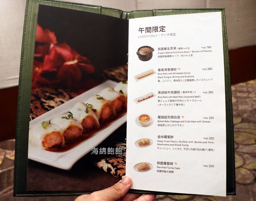 辰園蘿蔔糕、蟹黃明蝦餃、春風得意腸粉、鮑魚糯米燒賣、養生煲湯、
