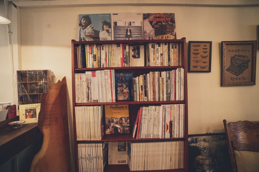 挑起了一本書,黑膠唱片與海報、我想這是 樓上的嬉皮與笑臉男經營者 給予空間的溫度與情懷