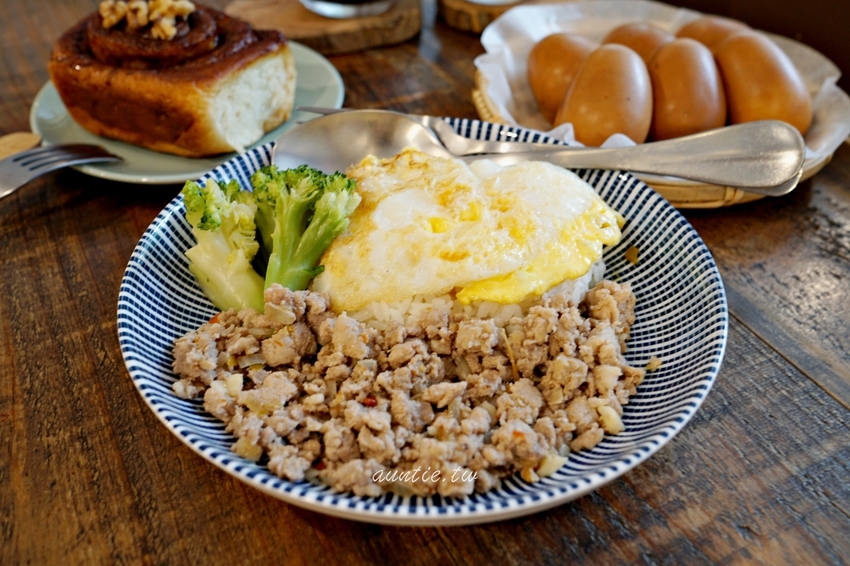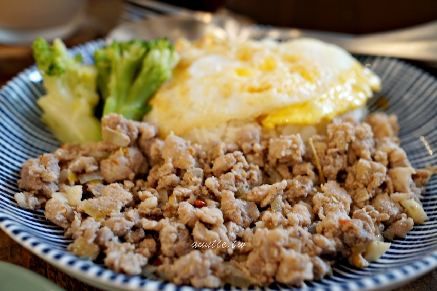 荷包蛋、打拋豬,配上一點燙花椰菜。打拋豬肉口味蠻辣的,重口味,擠上一點檸檬汁帶點酸味比較好吃,這天吃的白飯覺得有點硬,不過整體上蠻開胃的。