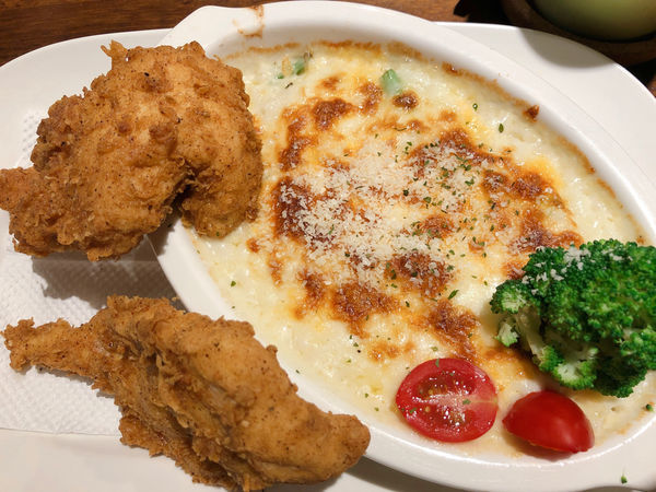 奶油焗烤雞排飯(260元)木宅真的太猛,雞排不流於俗套的放在裡面,而是直接擺出來給你看,而且足足有兩大塊,每一塊雞排都是鮮嫩有汁,奶油焗烤也不會太膩,不過一個人真的會吃不太完啊!CP值高