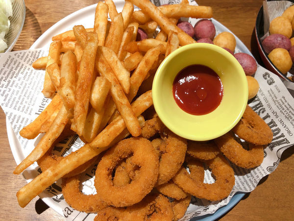 派對分享盤(230元),包含脆薯、洋蔥圈、地瓜球,木宅的炸物都有在水準之上