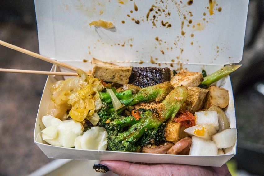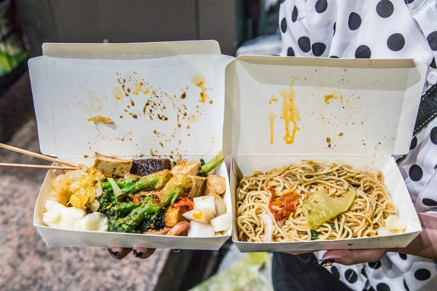 香腸炒米腸一百元套餐:有炒麵一盒、香腸、米腸、花椰菜、百頁跟黑輪,份量頗多,一個人吃有點太飽,加了自助配料看起來更澎湃,拿著餐盒香味不斷湧出,看來口味相當令人期待