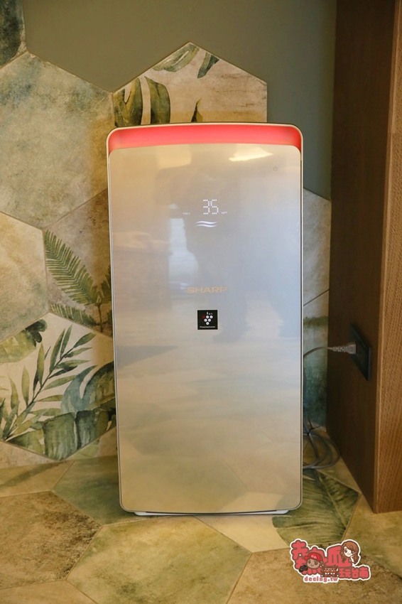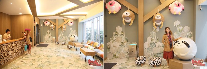 走進一樓接待室~寬敞的空間,地板是綠葉色調花紋延伸至牆壁,樹木設計的樑柱,樹蔭底下懸掛著好幾隻可愛的樹懶,一旁則擺放象徵春天色調的沙發椅,不僅如此也備免費茶水、咖啡機,角落更放置空氣清淨機淨化空氣,讓一樓彌漫著春天的氣息~
