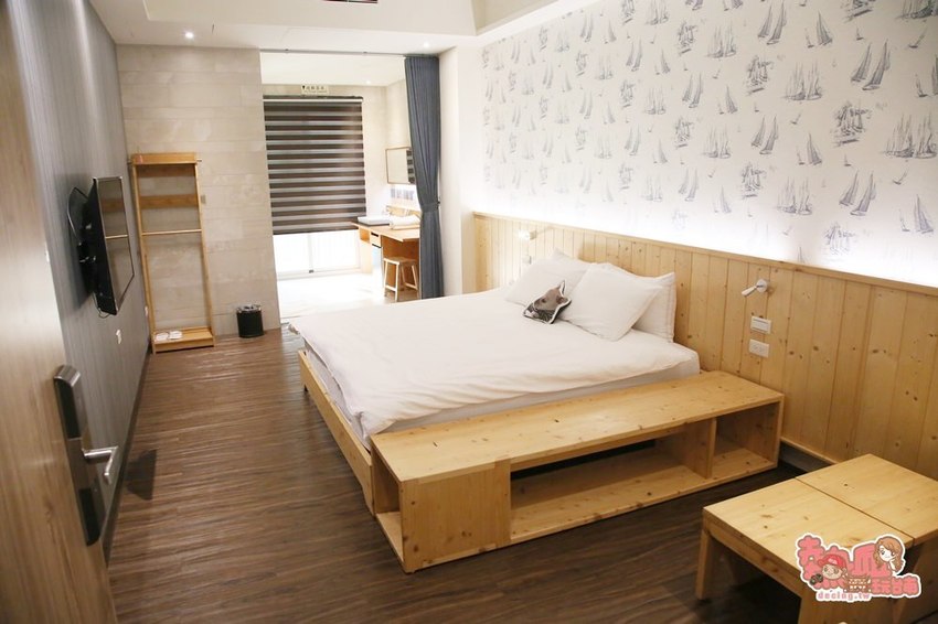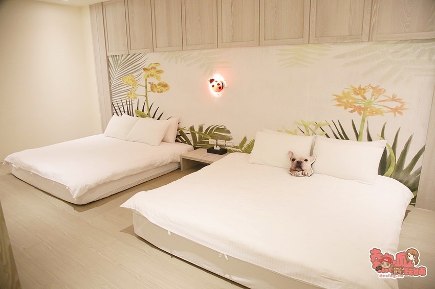 標準四人房床型為基本尺寸,側邊有著整面落地窗,走進去也令人忍不住會心一笑~特別的是,以樹屋為概念的旅社,時不時也會發現床上躺著可愛寵物抱枕~不管是拿來倚靠或當抱枕都是女生最愛~