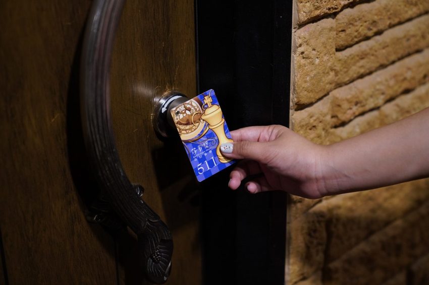 房卡採取感應式房卡,感應完後,門就可以轉開了。