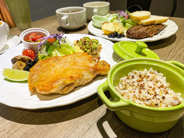 (烤雞腿、黎麥毛豆、椒鹽杏鮑菇、美式烤番茄、玉米筍、黑豆、綜合生菜)