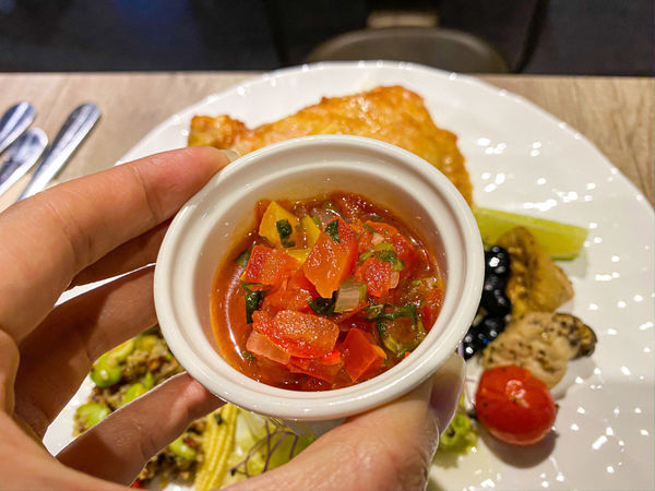 一切下皮很脆,雞腿排一入口鮮嫩多汁,外酥脆內軟搭配莎莎醬很清爽