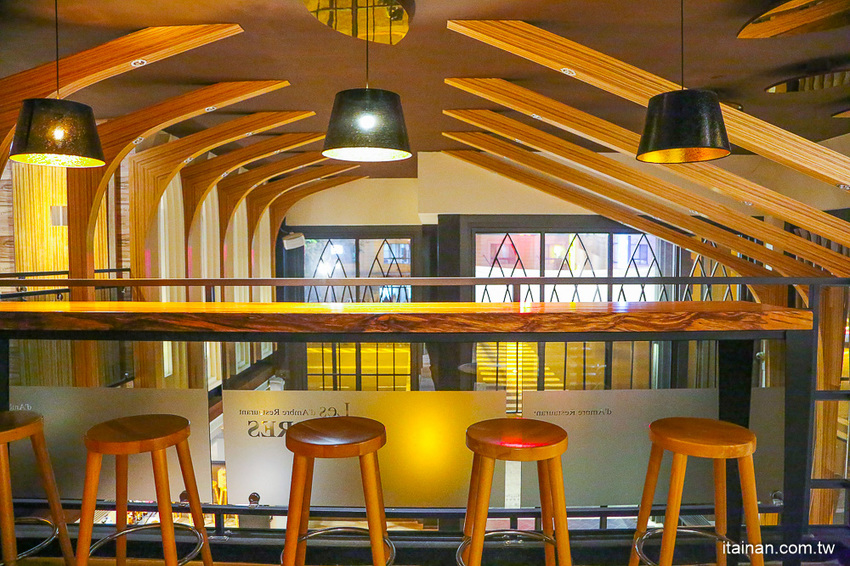 特別喜歡二樓這個小吧台區,利用挑高的設計做出像是小閣樓的感覺,可以望向一樓的落地窗,往前看去木質的裝潢一根根的整齊排列在眼前,就像在欣賞藝術品一樣,坐在這區特別有意境。
