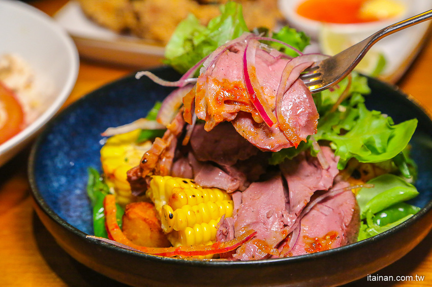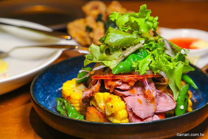 這道舒肥豬心烤青龍椒/玉米,是一道讓我又驚又喜的餐點,舒肥的料理方式讓豬心保有嫩口彈牙再帶點豬心的韌性口感,很有層次,豬心帶著特殊的香氣,淡雅又迷人,彷彿是有著類似碳烤的香氣又彷彿是台菜大鼎的鑊氣,完全沒有豬心的腥肉味,若不說真的很難讓人相信這食材居然是豬心,搭配著裡面的烤蔬食(青龍椒、玉米),口口香氣瀰漫,一點點的洋蔥絲讓清爽度更提升,是今天我最愛的一道料理。