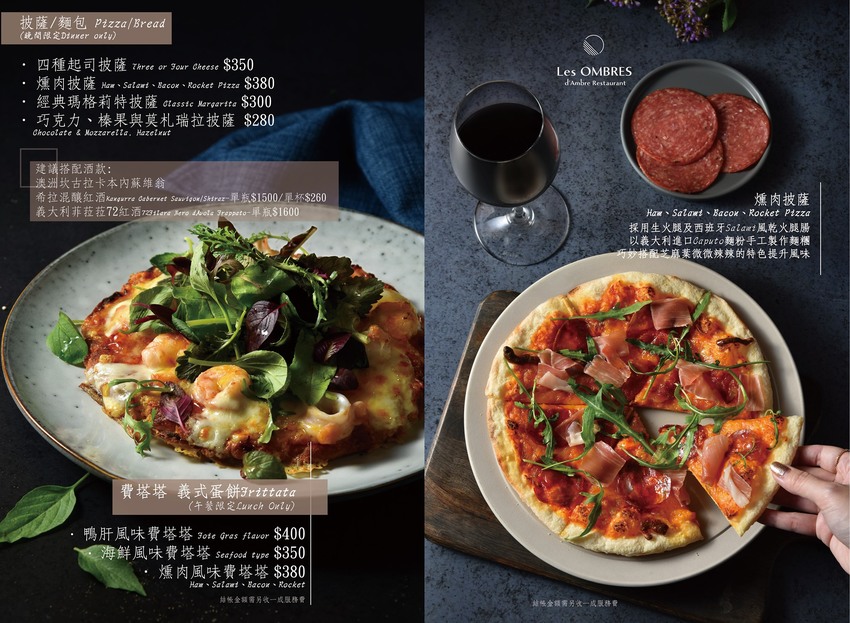 「Les Ombres 光影新歐陸料理」的菜單主要類別有:前菜、沙拉、義大利麵/燉飯、費塔塔 義式蛋餅、披薩、主菜…等。原以為這樣的質感餐廳再加上主打歐陸料理餐點應該頗貴,想不到價格帶還算平實。聽說之前是以一個set的套餐方式供餐,現在則是改為單點方式的供餐,若是兩~三人用餐,也可以更彈性的點餐一起分食,所以即使是家庭聚餐,也很合適,還可以吃到更多不同的料理呢。