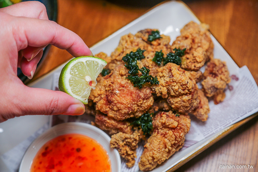薑味炸雞是以老薑、蠔油以及東南亞香料等基底,經過8小時的醞釀醃漬入味,再經過油炸,搭配檸檬或是佐上酸酸甜甜的燒雞醬一起吃都很合味。
