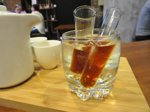森高砂咖啡的咖啡原豆產自台灣各地,口感十分多元化,menu中也會介紹各種咖啡不同的口感,讓顧客能挑選自己喜歡的咖啡。當温熱的咖啡端上桌時,才發現原來不只是一杯熱咖啡,另一杯冰水中還插著一支裝著冰咖啡的試管,前方的小玻璃杯裡面還盛著冰塊,將試管中的咖啡倒入玻璃杯中,就可以品嚐冰咖啡的滋味,是一種很有意思的設計,非常推薦喜歡精品咖啡的人到此試試。