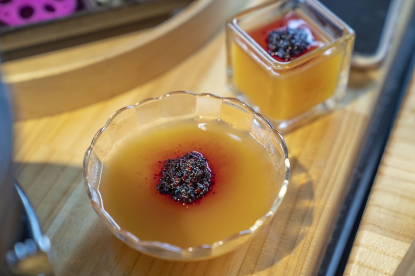 這次的無菜單料理小菜有油炸茄子、醃製蓮藕片、龍鬚菜,其中龍鬚菜比較特別的是上面的醬料,是店家自製的馬告山胡椒醬料,吃起來有種類似香茅的口味。