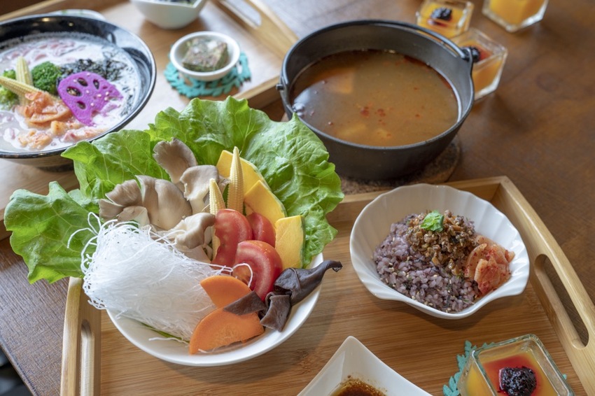 微涼的天氣最適合來一份暖胃的小火鍋了,「舒食小火鍋」有三種湯底可以選擇,分別是咖哩、豆乳以及麻辣鍋底,鍋底裡已經有一些熬煮入味的蔬菜,菜盤有秀珍菇、玉米筍、南瓜、番茄、蘿蔔、木耳、粉絲等等,蔬食版的麻辣小火鍋吃完之後罪惡感瞬間降到最低點,清爽但又能吃得超過癮!