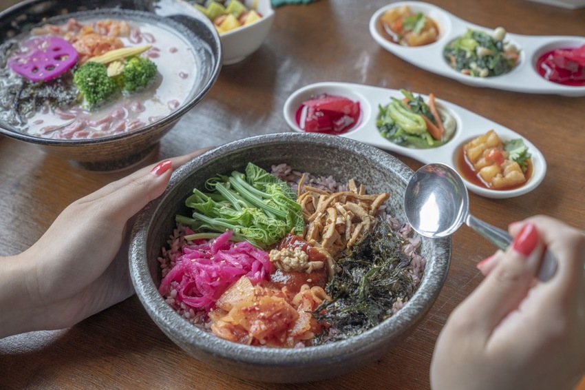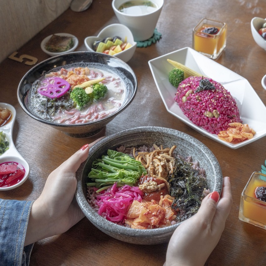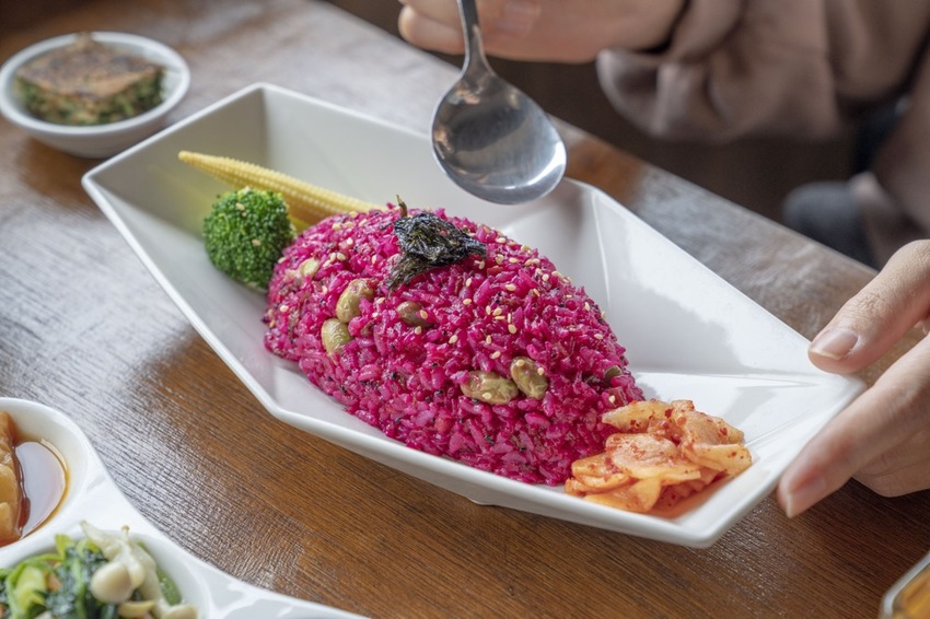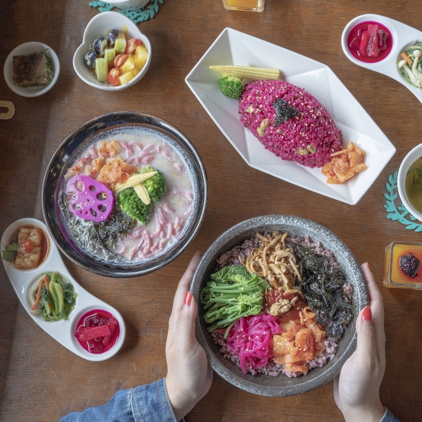 素食版的韓式拌飯,上面的的蔬菜有泡菜、龍鬚菜、泡菜、龍鬚菜、豆干絲、紫菜和醃漬小菜,舒食男孩他們家的醃製菜都是用火龍果等天然食材醃製的,不用擔心看到顏色這麼鮮豔以為是用色素做的,完全可以放心吃!