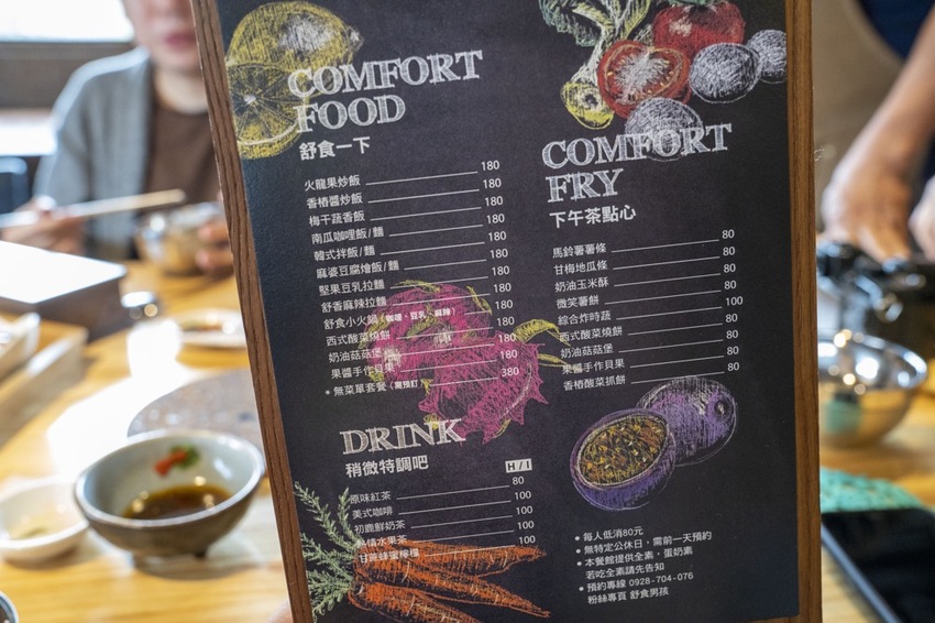 舒食男孩餐點主要有主餐、點心及特調飲料,價位在80元-180元,每人低消80元。
