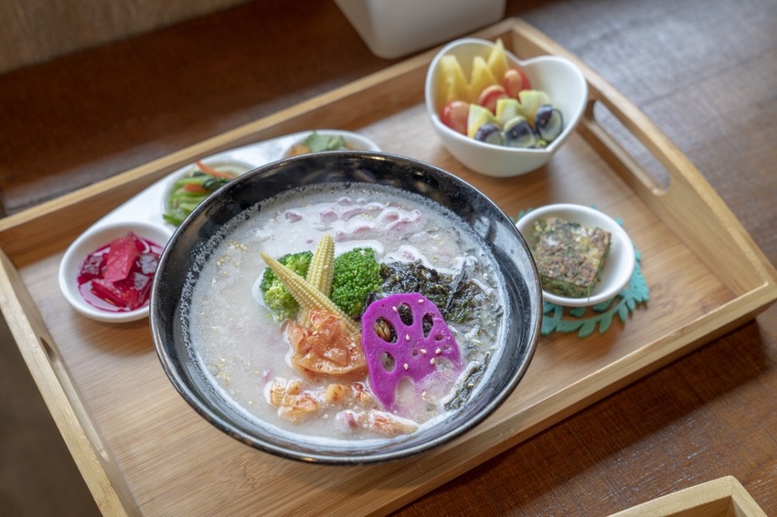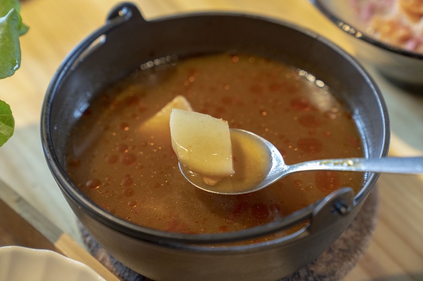 以芝麻、腰果、芋頭、花生等多種根莖堅果類的食材,加上豆漿為基底熬煮的湯頭,喝起來非常濃郁香醇,麵條是紅麴麵條,配上自製泡菜和醃製甜菜根小菜一起吃,口味非常有層次感!