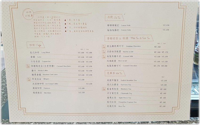 店內飲品菜單,有咖啡、冰飲蘇打、奶茶、花果茶可選,搭配甜點更是一絕~