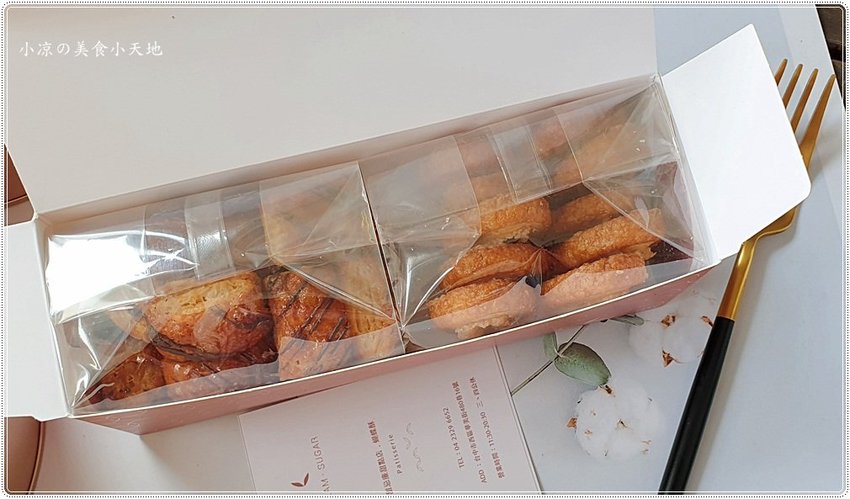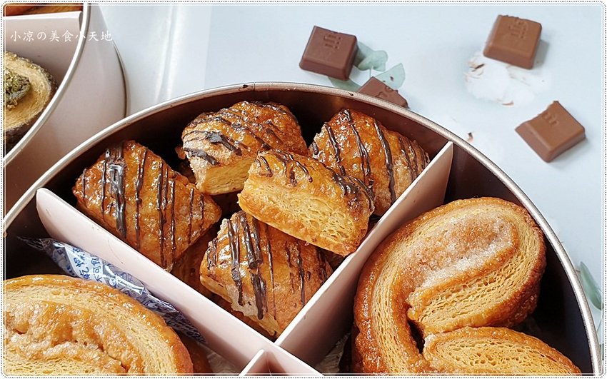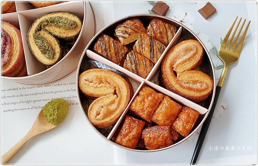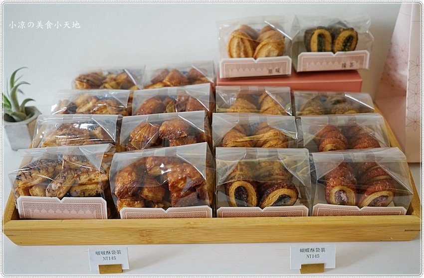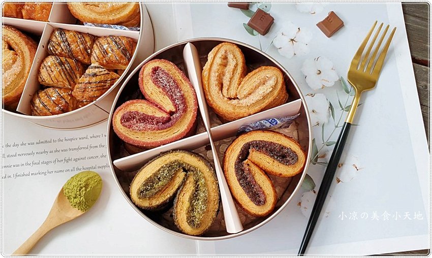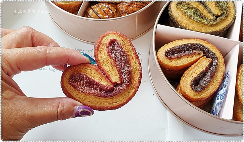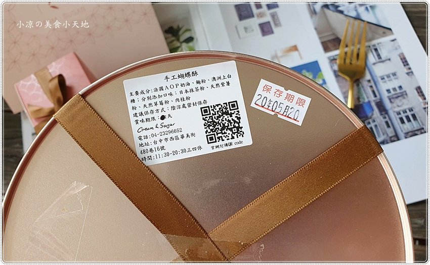 手工蝴蝶酥採用的成分、保存期限都會貼心地貼在盒底,但最好的嚐鮮就是當日往肚子裡裝,對於蝴蝶控的小涼來說根本就不想放隔日XD (奶素)