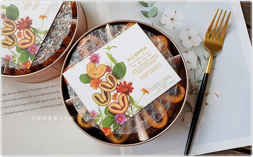 打開鐵盒後,淡淡的香氣撲鼻而來,附上甜忌廉蝴蝶酥的介紹小卡,並以氣泡袋去保護蝴蝶酥,相當的貼心!