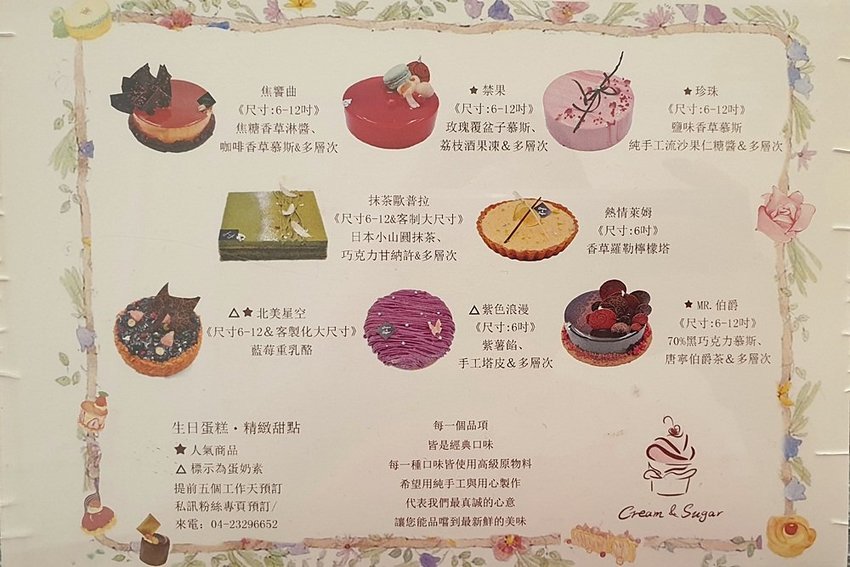 甜忌廉甜點店 Cream&Sugar除了經典的甜點以外,還有生日蛋糕、以及送禮的大尺吋蛋糕,圖下可參考,有需要啥口味也可跟店家討論,蛋糕類需五天前預訂喔!!