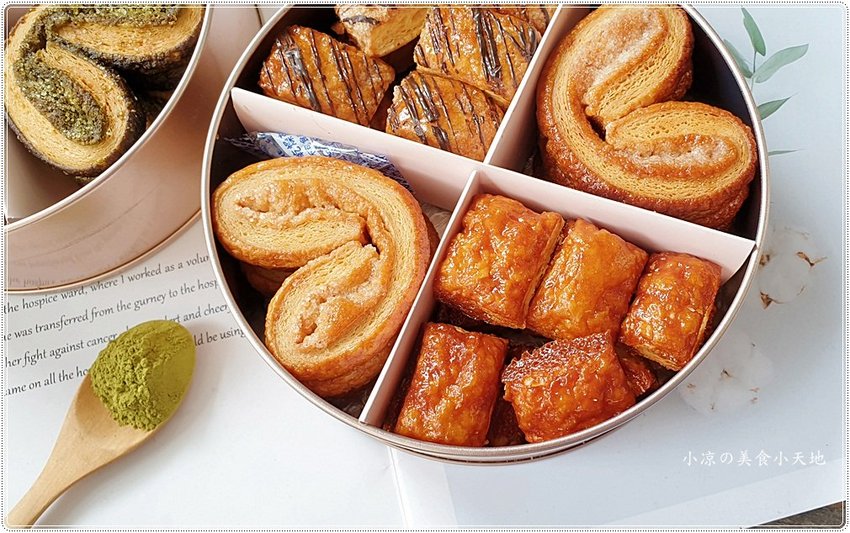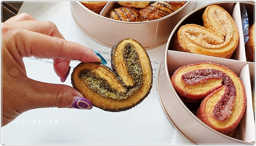 抹茶蝴蝶酥,採用日本宇治抹茶粉來製作,第一口還沒有那麼明顯的感受到抹茶的苦澀味,只有蝴蝶酥的奶香及酥脆,咬到中間的部位,那突然襲擊來一股濃厚的茶香以及微微的苦澀味道,順勢再來一大口、咀嚼間那抹茶的風味真的明顯又有層次,是抹茶控的最愛滋味。