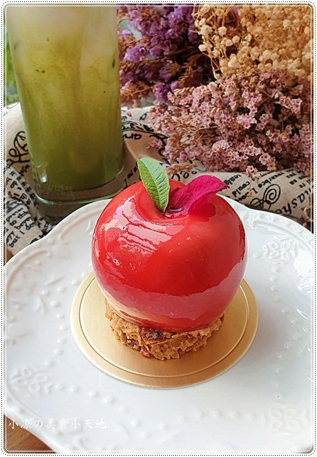 An Apple,如同鏡子一般光滑平整的鏡面蛋糕,表層讓蛋糕看起來亮亮的,甚至不一樣的角度還可以反光看到自己的影子,美到下不了口的高質感的甜點。細膩的慕斯入口即化、碰撞上了微酸的莓果餡,底層的蔓越莓餅抵相當酥脆,整體來說宛如王子遇上了公主般的幸福滋味,午後時光跟情人、姊妹來享受不一樣的甜食,真的超sweet~