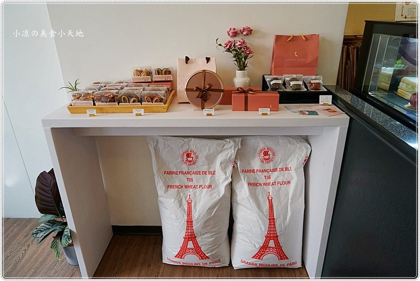 另一櫃檯上將伴手禮、點心類的全品項擺放出來,供客人好選購,底下的法國麵粉就是用在製作蝴蝶酥以及甜點的食材之一