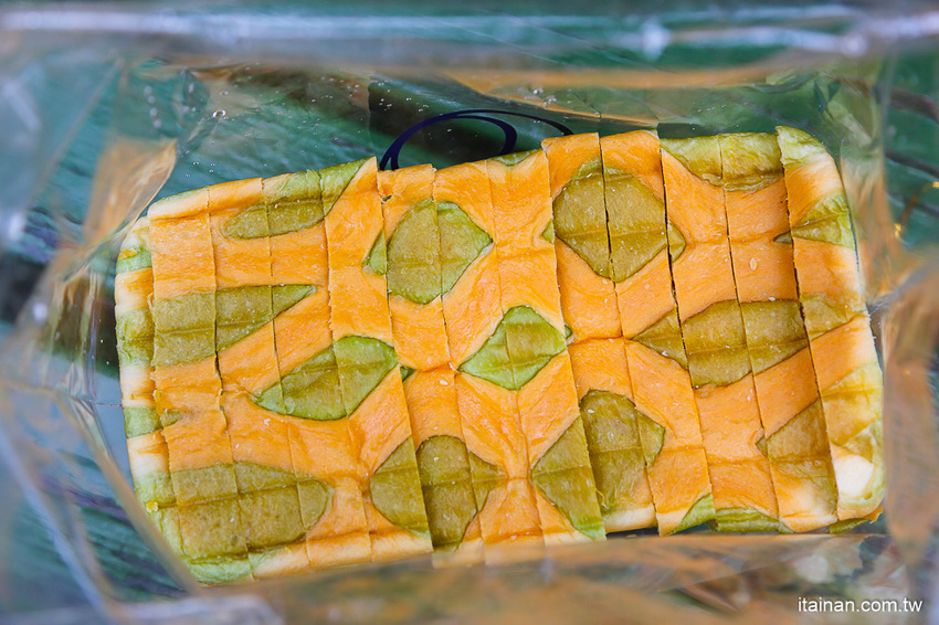 招牌關廟鳳梨吐司,外型的設計非常有意思,因為是採用關廟鳳梨來製作吐司,為了增加特色更是把土司外型做成像鳳梨般,那菱形般綠色的設計,就是仿鳳梨外皮上一目一目的樣子呢。