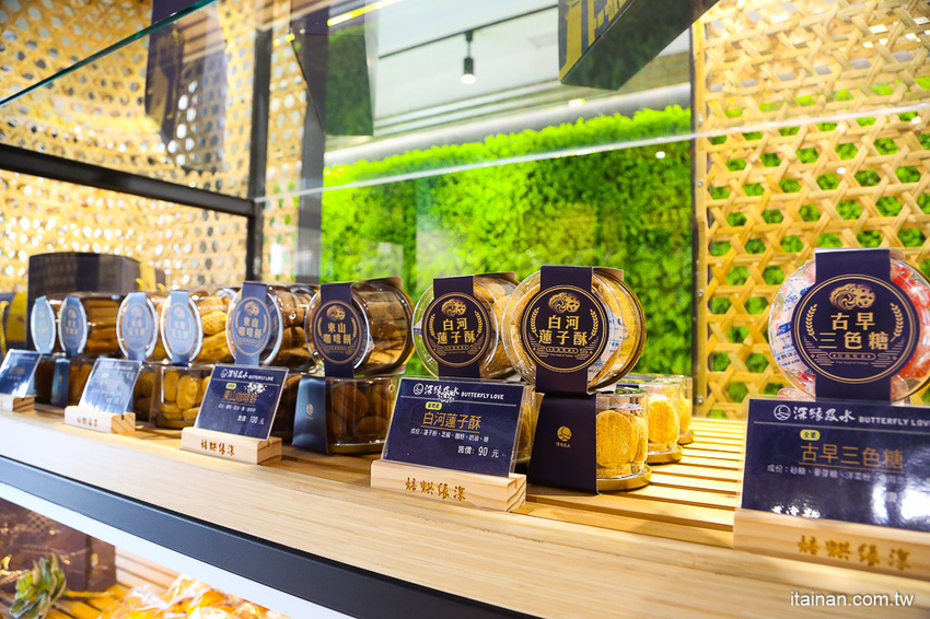 除了麵包外,「深緣及水」在點心的製作,更是結合了台南的農產品,來達到促進產銷。也能強化觀光客對台南的深刻記憶,像是一看到後壁米餅就會想起後壁的米,看到東山桂圓酥就會想到原來東山產桂圓。