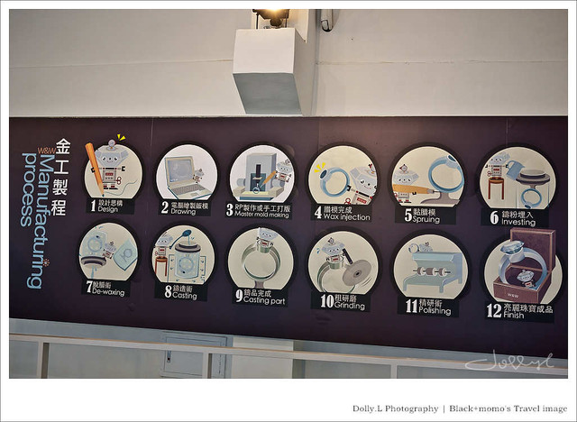 簡單的金工製程圖說,讓遊客了解珠寶飾品如何經由設計、打版、開模、精密鑄造和抛光等步驟而成為一件件美麗的成品。