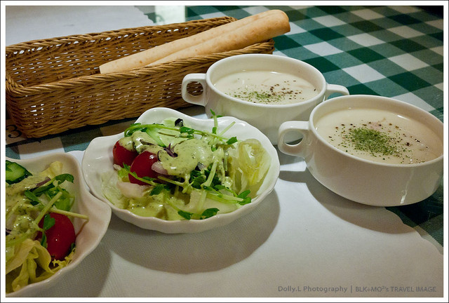 生菜沙拉與濃湯都挺好吃的,特別是附餐的手工麵包口感與香氣很不錯,帶著鹹香的起司味與濃湯超搭配的!!