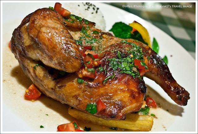 以特製的草莓啤酒醃製新鮮半雞,烤雞嚐起來略帶甘甜味道與迷人香氣,切開時還很多汁呢!上頭的番茄與九層塔讓味蕾感受到更多的層次。