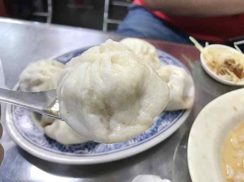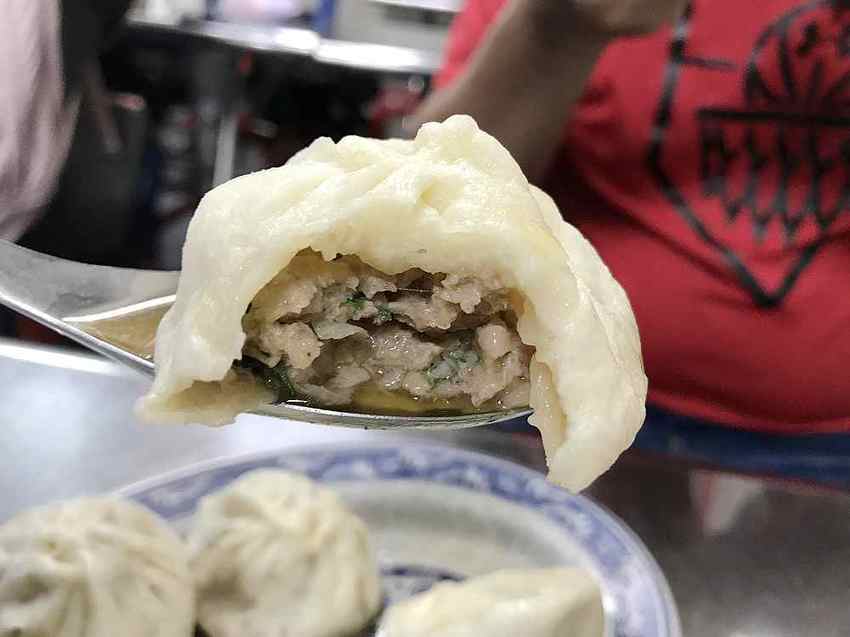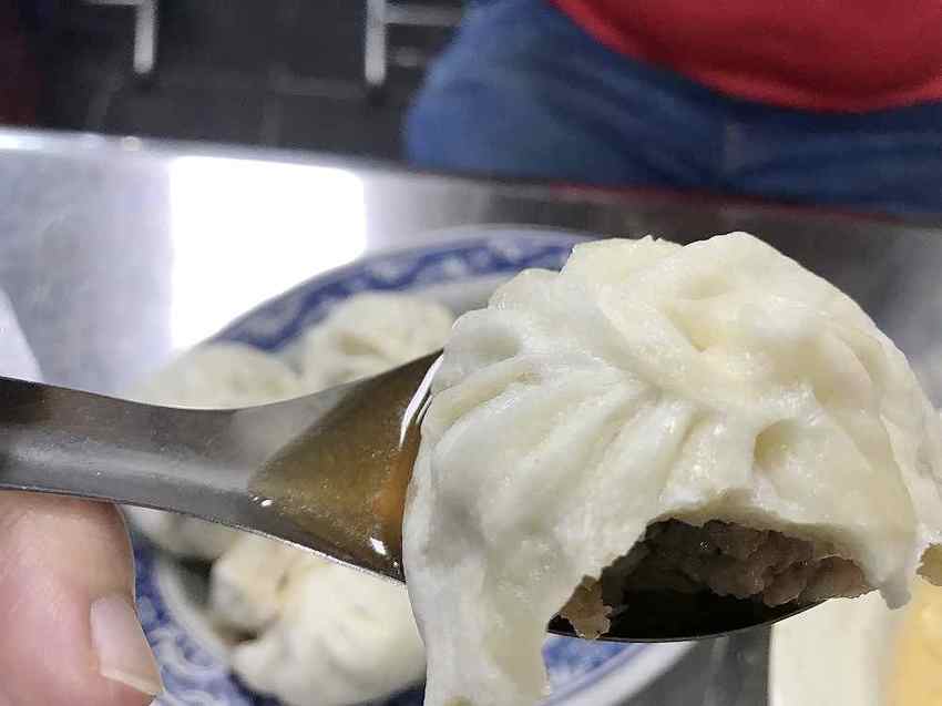 吃這小籠包一定要搭配湯匙,因為一口咬下湯汁就冒出來了,怎麼能錯過這些精華呢,