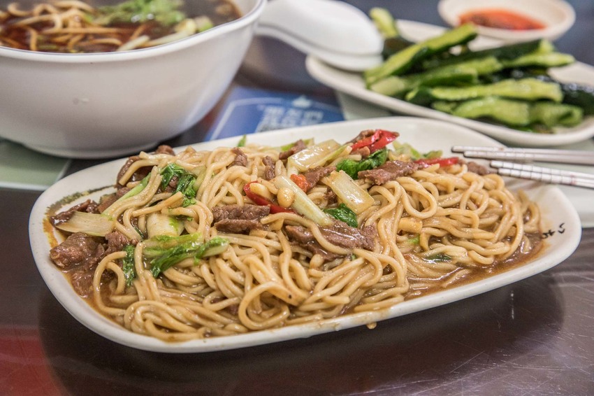 等了一段時間餐點上桌,原本是要點牛肉麵,但老闆告知牛肉還沒燉好,現在沒有,所以改點牛肉湯麵跟牛肉炒麵外加招牌小黃瓜,牛肉炒麵一上桌那香氣實在逼人,感覺就像去台式快炒店點蔥爆牛肉一樣的味道,超想來碗白飯!