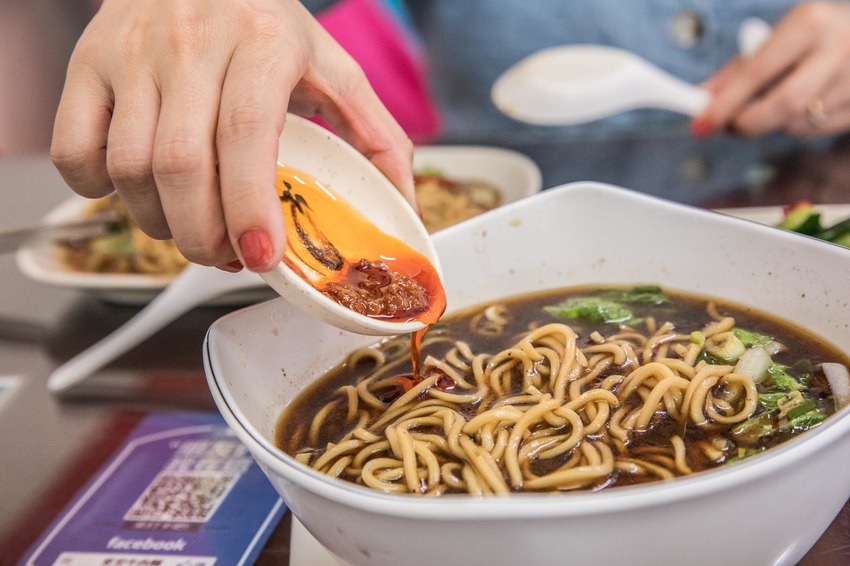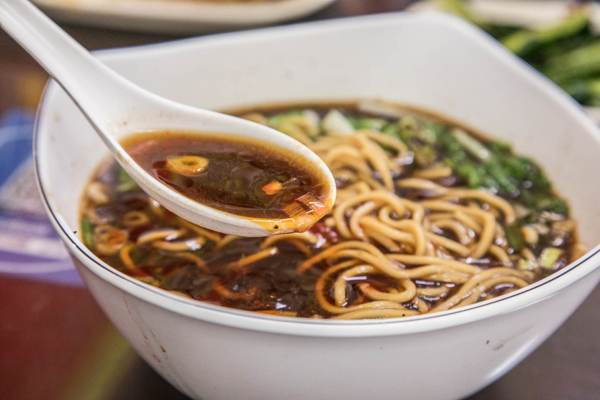 家宏牛肉麵的牛肉湯湯色很深,但口感比較清爽,飄著淡淡的中藥香味,喝起來輕甜順口,但咬咬還是喜歡比較重口味的湯頭,所以加了店家的辣醬,有點辣更增加了湯頭層次