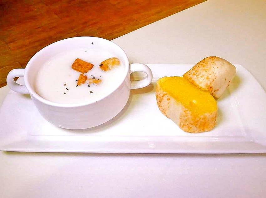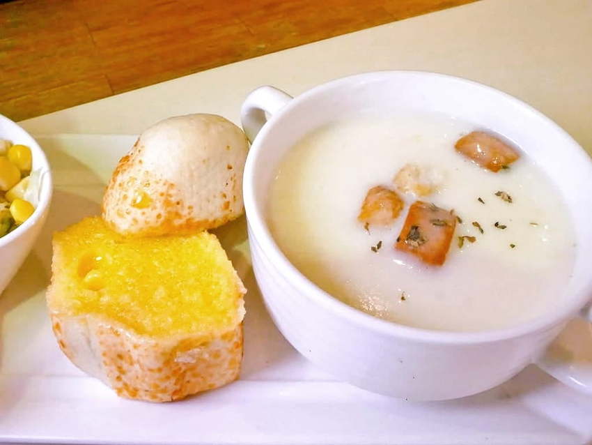 這是牛排套餐所附的特調濃湯&麵包&沙拉