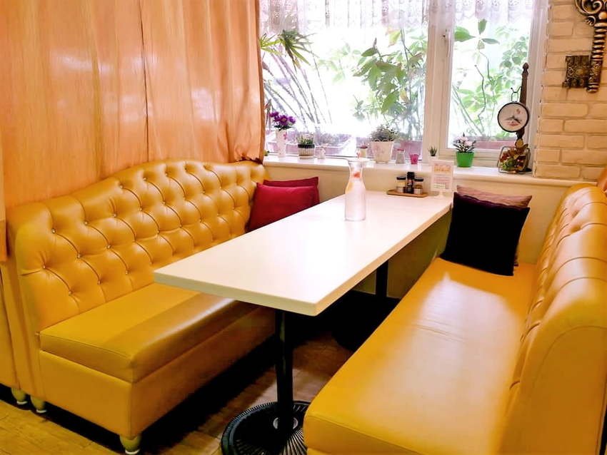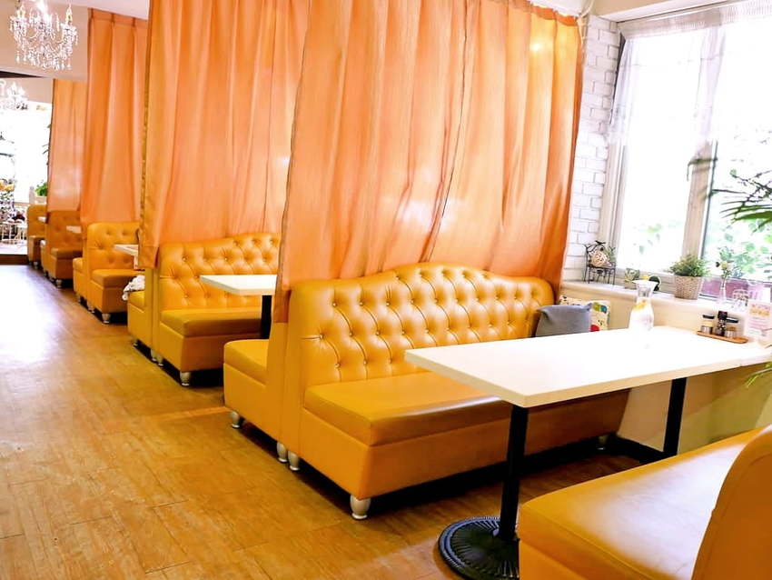 Oyami café特別替客人加上了粉橘浪漫布簾. 將座位做個隔間