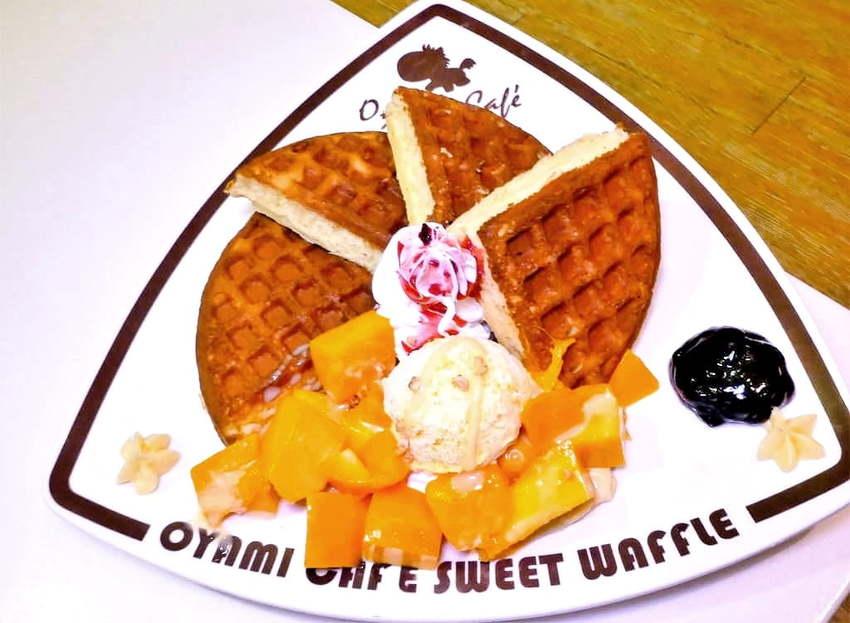 酥脆蓬鬆的格子鬆餅.新鮮多汁的愛文芒果及甜蜜的煉乳.再加上冰淇淋與清爽鮮奶油,是夏季最佳甜品