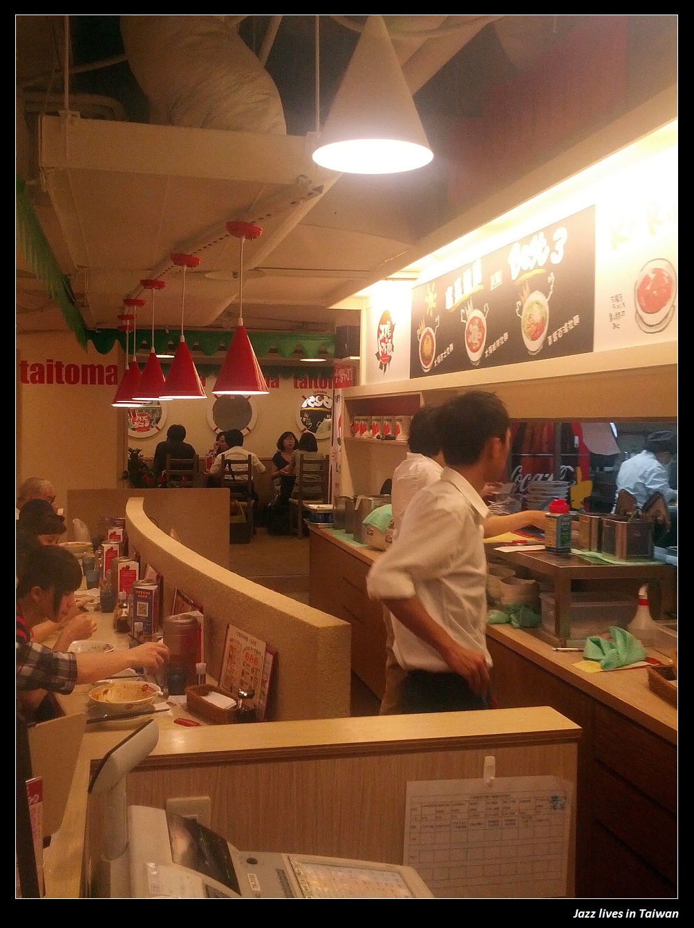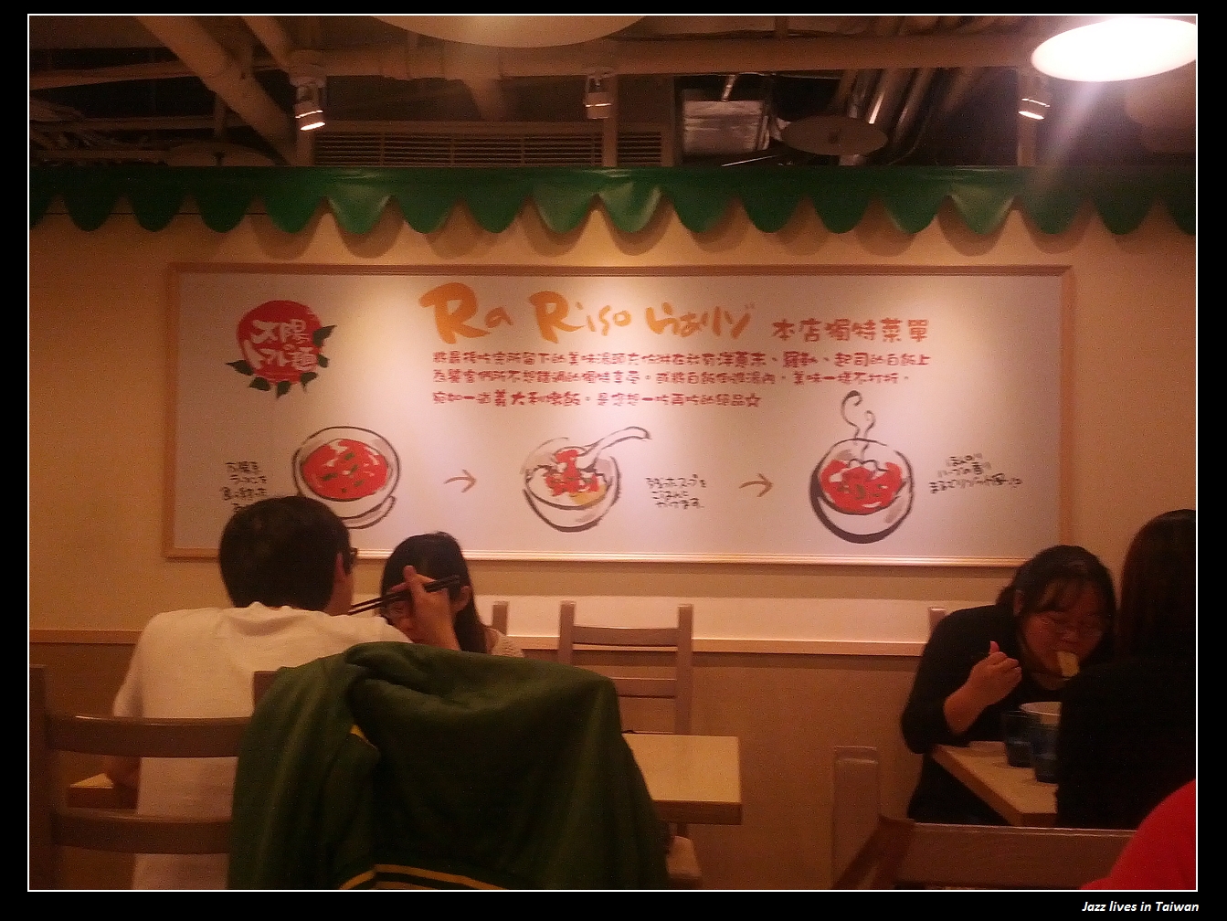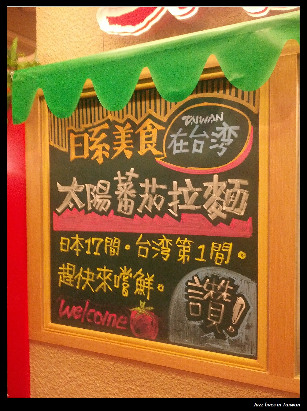而門的另一邊為黑板, 上頭寫著, 這間是台灣的第一間分店, 而日本目前共有17間,