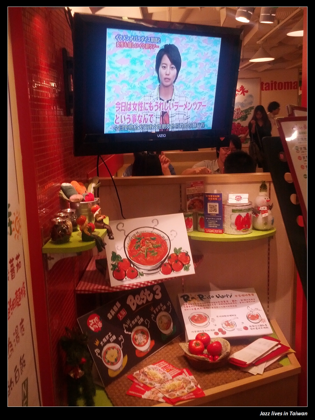 門口的兩邊, 一邊撥放著蕃茄拉麵的用餐方法與日本藝人的合作節目, 下頭還有人氣排行榜,